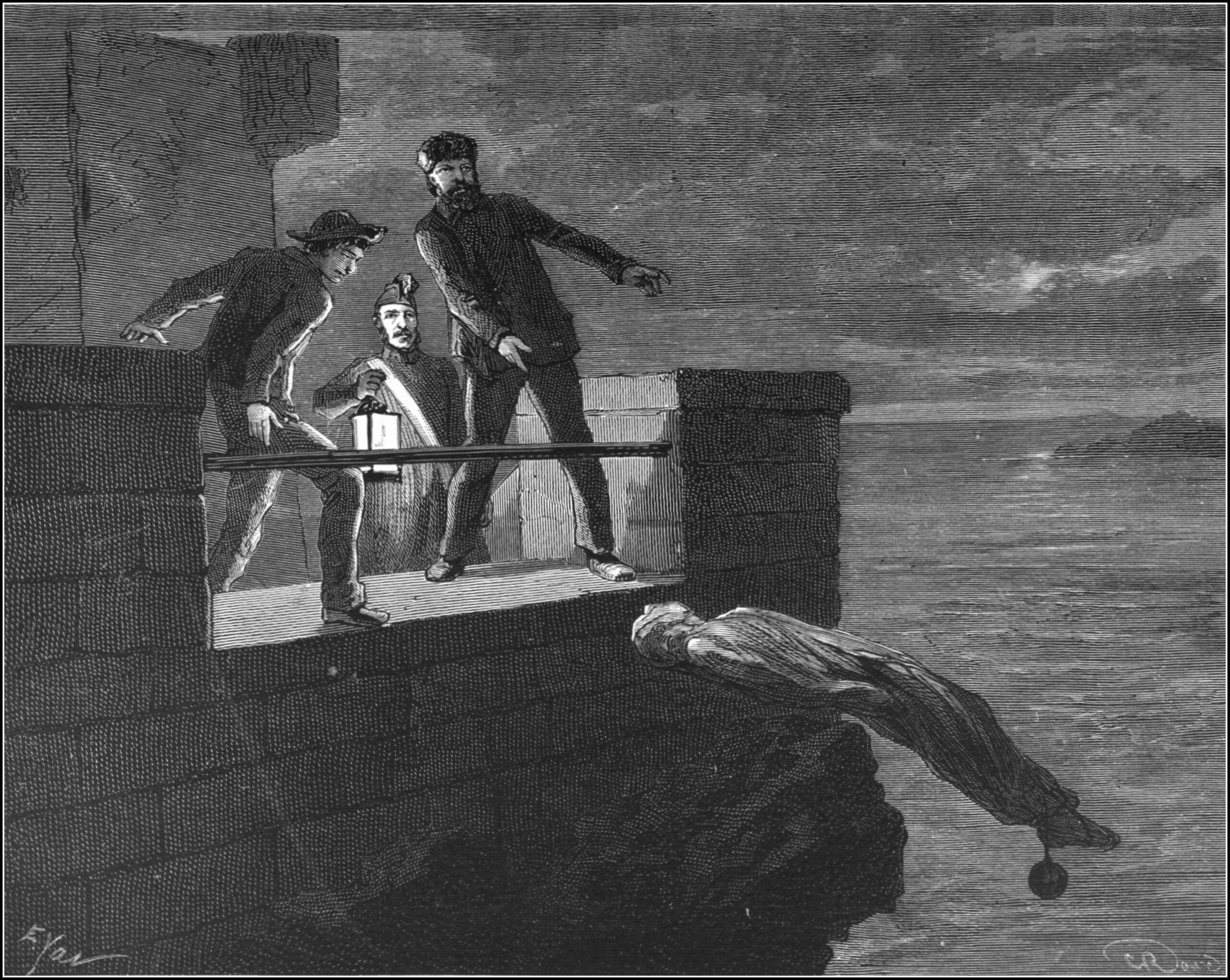 Liksekken med en høyst levende Dantès kastes på sjøen.Lisens: Public Domain